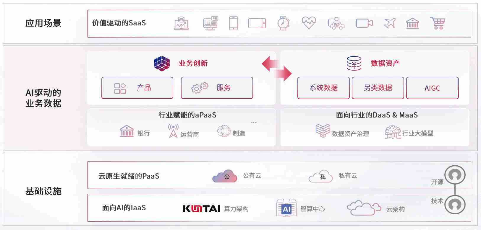 数字时代,,,,围绕企业数字化转型的关键要素,,z6尊龙旗舰厅数码开创性的提出数云融合战略和技术体系框架,,,,着力在云原生、、、数字原生、、、AI原生和信创产业上架构产品和服务能力,,为处在不同数字化转型阶段的快消零售、、、汽车、、、、金融、、医疗、、、政企、、、、教育、、运营商等行业客户提供泛在的敏捷IT能力和融合的数据驱动能力,,,构建跨界融合创新的数字业务场景和新业务模式,,,,助力企业级客户建立面向未来的核心能力和竞争优势,,全面推动社会的数字化、、智能化转型升级。。。。