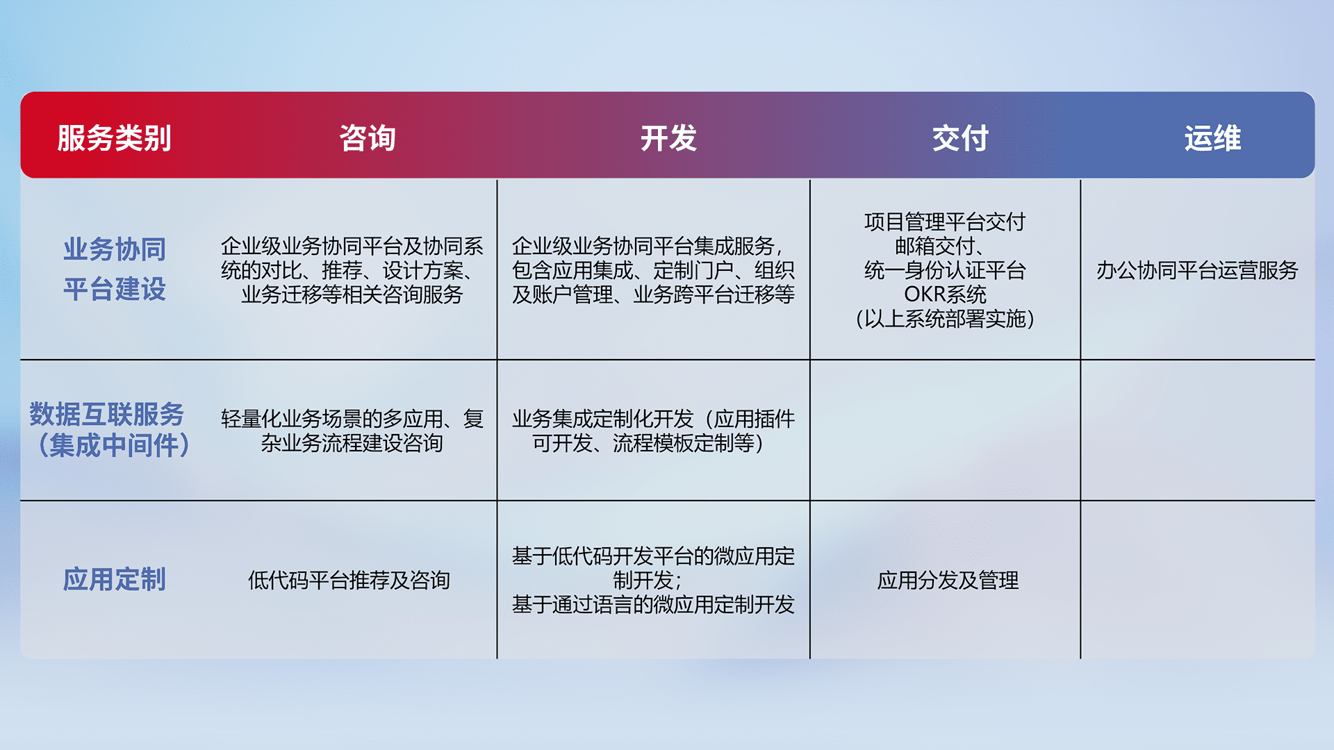 针对钉钉、、、企微、、IDaas等平台级产品提供产品的规划、、方案、、、交付、、、、定制化开发等服务,,实现如统一协同办公、、智能客户服务、、、、混合会议管理、、、智能数据查询、、、、等业务场景,,,,实现数字化转型。。