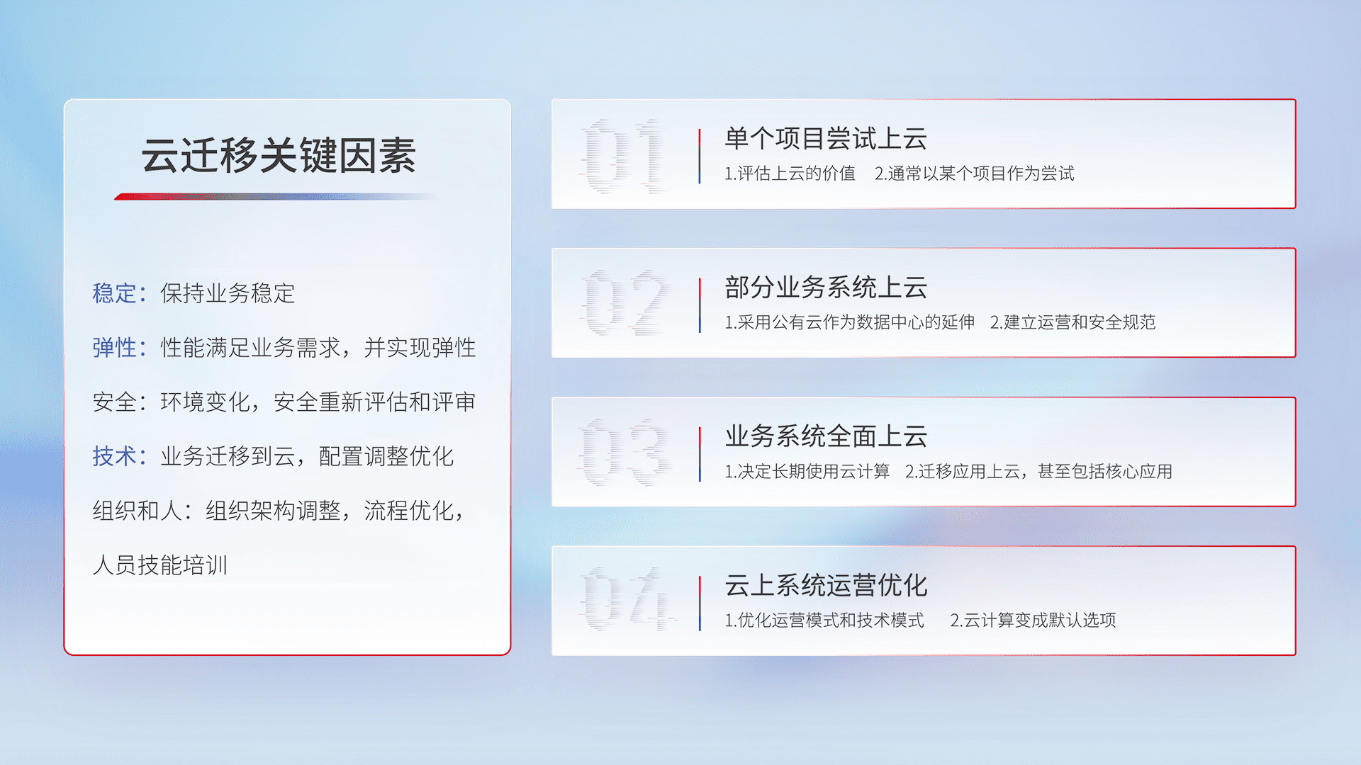 结合实际业务,,从规划设计、、云平台选型、、云原生改造、、、数据迁移、、集成交付,,,,迁移全过程为客户识别最佳上云路径,,,,做好风险识别管理,,设计网络架构、、身份权限、、、安全审计合规、、、操作审计、、、日志审计、、、、监控告警策略、、、、多站点容灾设计等,,对云上基础设施进行整体规划,,提升IT治理水平,,以满足弹性、、高可用、、、、高性能的需求。。。。